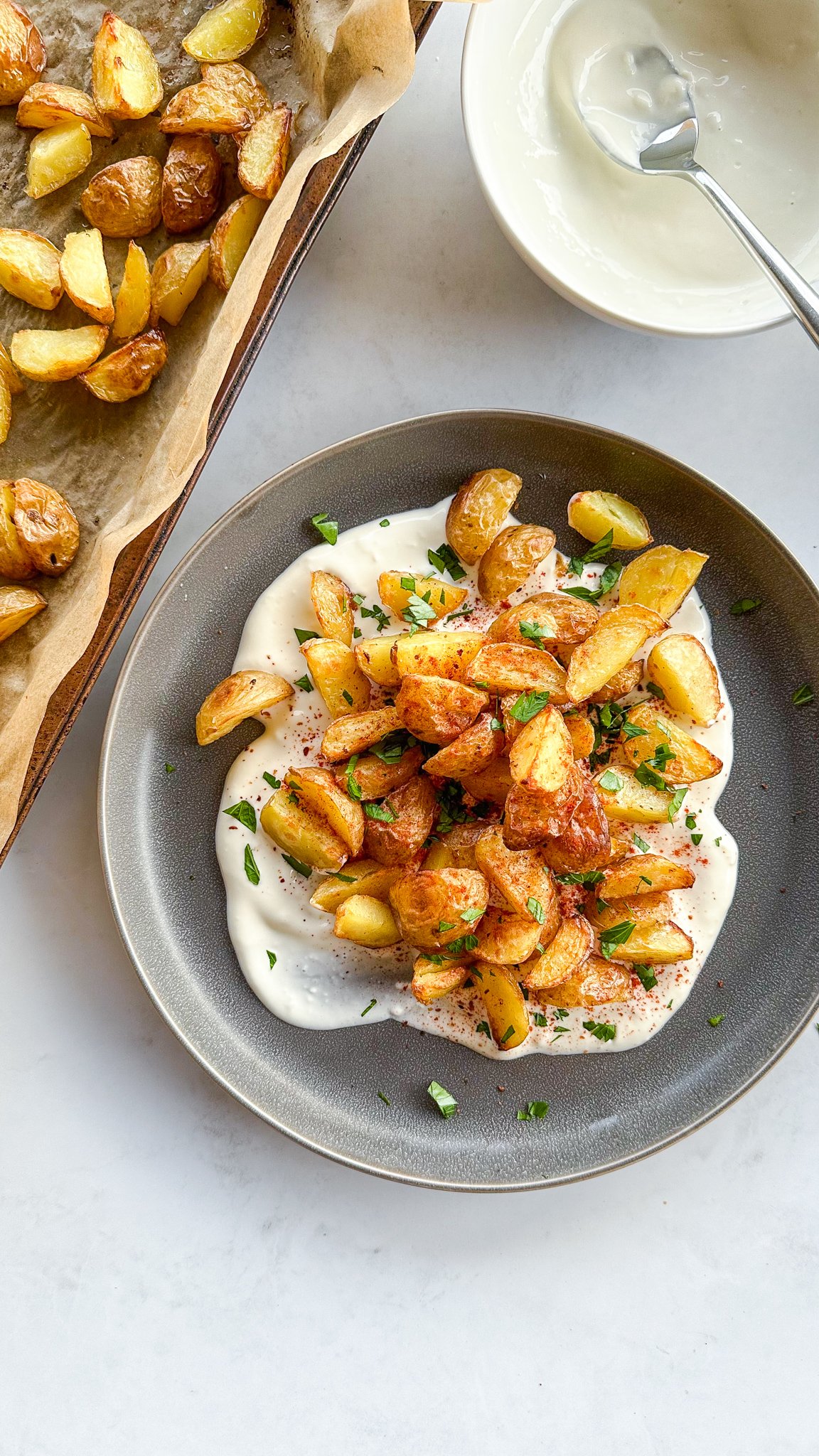 Add the garlic aioli to the bottom of the plate, then top with potatoes, Aleppo pepper (mildly spicy), smoked paprika and parsley.